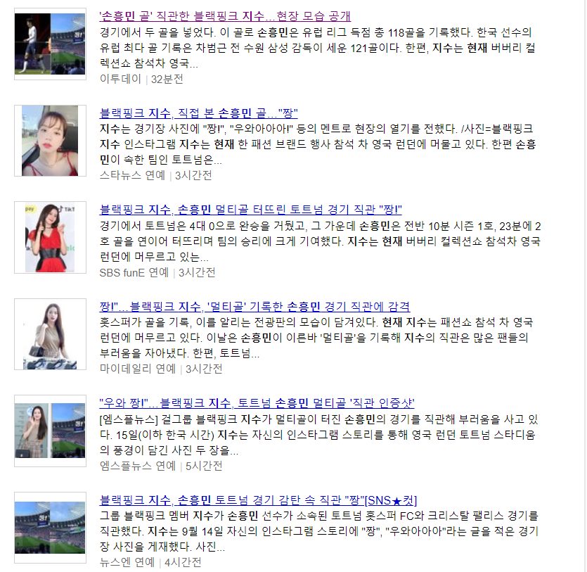 Được biết, nữ ngôi sao đã đến cổ vũ cho cầu thủ Son Heung Min và chụp lại khoảnh khắc mà anh ghi bàn thắng trên sân cỏ với những chú thích như: “GOAL, cchang!” và “Woaaa!” kèm bảng ghi tỷ số 4-0. Ngay lập tức, nhiều tin đồn cho rằng Jisoo đang hẹn hò với nam cầu thủ nổi tiếng được lan truyền trên nhiều diễn đàn. Tuy nhiên, nó chỉ dấy lên trên một số trang web nhỏ lẻ và chưa có sự ảnh hưởng lớn đến truyền thông và báo chí Hàn Quốc.