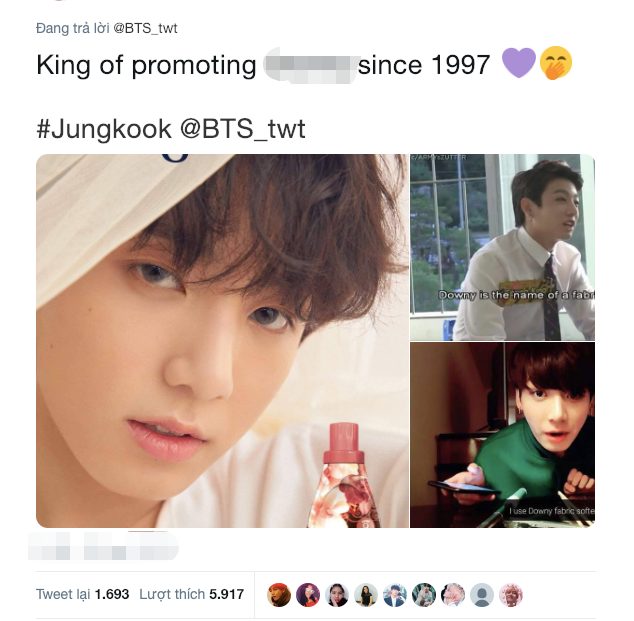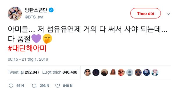 Thật bấy ngờ vì ngay sau đó, ARMYs đã “kéo nhau” mua sản phẩm nước xả vải tương tự để sử dụng dẫn đến thiếu hụt sản phẩm tại các cửa hàng và tên của sản phẩm lập tức đứng đầu bảng xếp hạng tìm kiếm thời gian thực của Naver. Nhiều người còn gọi anh là “King of promoting” vì sức ảnh hưởng của anh quá lớn đối với sản phẩm này!