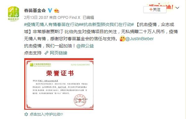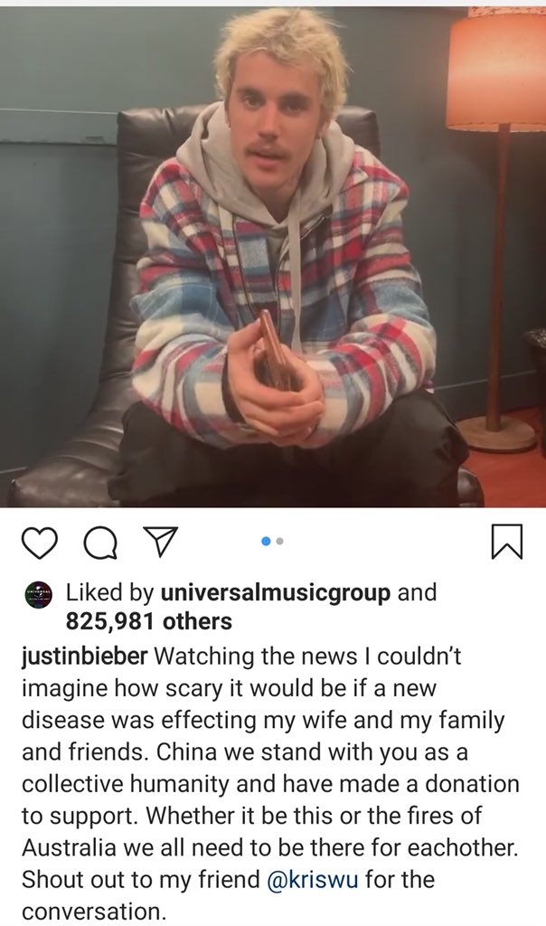 Vào ngày 13/02, tài khoản Quỹ từ thiện Xuân Miêu Bắc Kinh đã đăng tải giấy chứng nhận làm từ thiện của Justin Bieber lên mạng xã hội với nội dung: “Chân thành cám ơn đến ông Justin Bieber vì đã quan tâm đến hạng mục tình hình dịch bệnh. Ông đã không suy nghĩ nhiều mà quyên góp 200.000 NDT. Tình người hiện hữu trong tình cảnh dịch bệnh. Cám ơn ông đã tin tưởng và ủng hộ cho quỹ từ thiện Xuân Miêu Bắc Kinh. Chúng ta cùng cố gắng để chống lại dịch bệnh!”