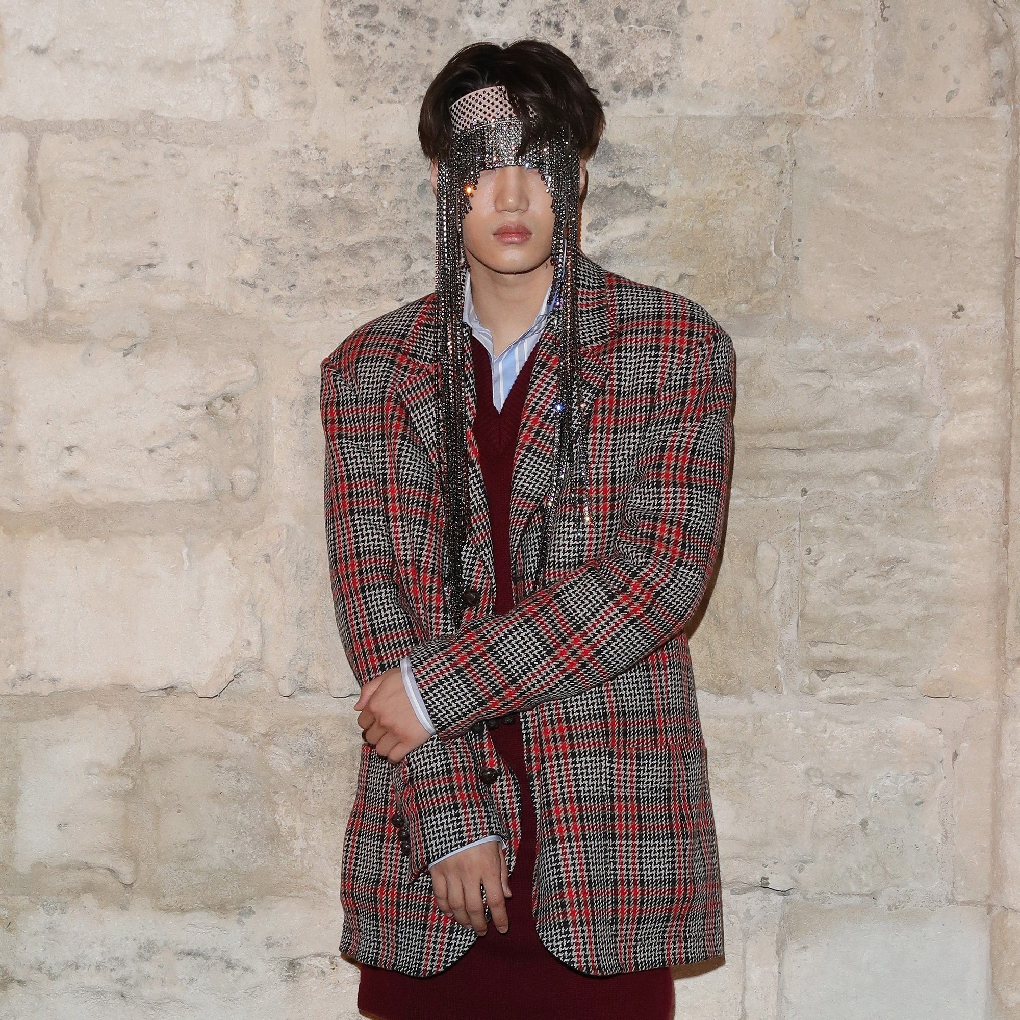 Bạn có nhớ ngày đó KAI đã xuất hiện tại show thời trang Gucci, ăn mặc như một ông hoàng không? KAI là người Hàn Quốc đầu tiên trở thành đại sứ toàn cầu của Gucci, và anh ấy xứng đáng với danh hiệu này. Bộ vest kẻ, áo len dài, giày giống hoàng tử, và tất nhiên, chiếc băng đô màu da có pha lê và xâu chuỗi bằng rìa pha lê rơi xuống ngực và treo trước mắt. Một khoảnh khắc thời trang kinh điển.