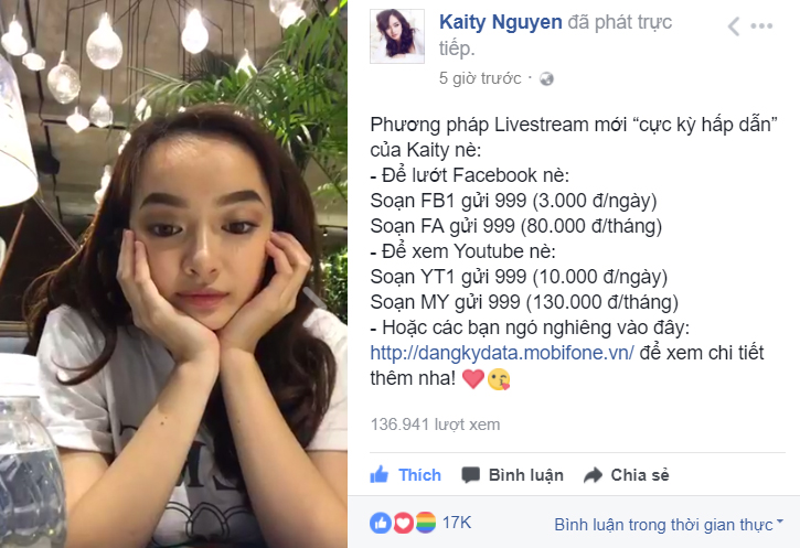 “Vì phải di chuyển đến nhiều địa điểm quay, phần lớn không có wifi, vì dùng mạng MobiFone, Kaity đã sắm cho mình gói cước Facebook data, soạn FA gửi 999 và Video data, soạn MY gửi 999 để tha hồ lướt Facebook Livestream cùng fan và xem clip món ăn ngon, make-up trên Youtube”, Kaity hào hứng nói.