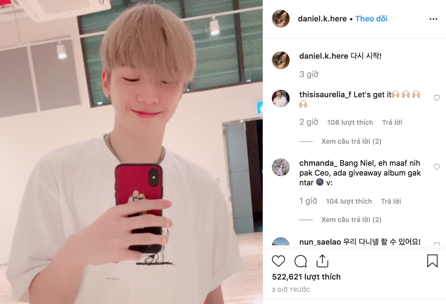 Sau đó 1 giờ, anh chàng lại tiếp tục đăng tải một bức ảnh “tự sướng” trong phòng tập nhảy với dòng chú thích: “Bắt đầu lại!”. Phải chăng Kang Daniel đã chuẩn bị một tinh thần lạc quan quay trở lại sân khấu và đang đi đến những giai đoạn cuối cùng cho việc ra mắt sản phẩm mới?