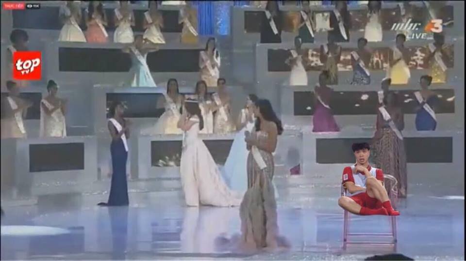Chiếc ghế đơn điệu này dường như phù hợp với dáng ngồi của Công Phượng hơn là đương kim Hoa hậu Thế giới.