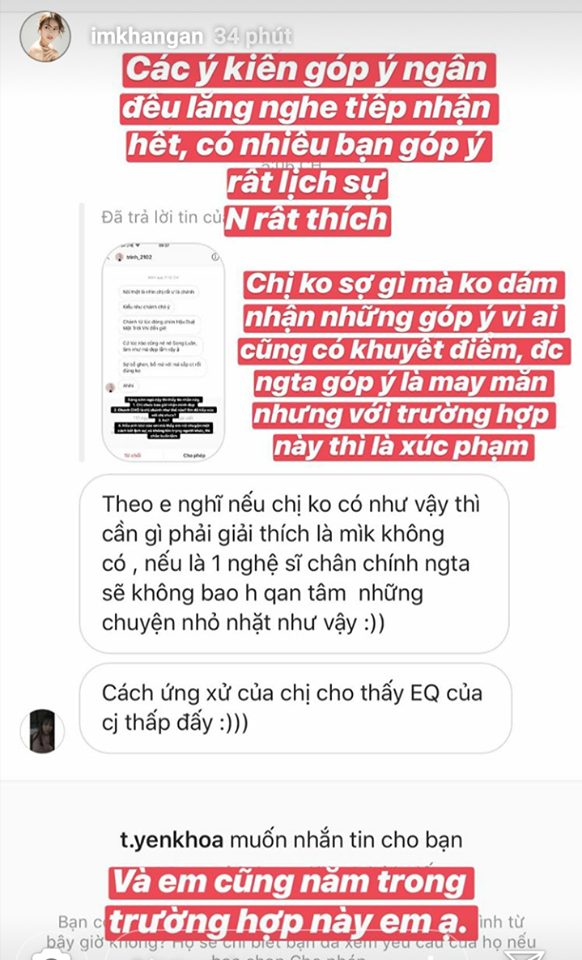 Cứ ngỡ sau khi Khả Ngân “nhắc nhở” nhẹ như thế thì mọi việc sẽ kết thúc. Nhưng không, ngay sau đó một antifan lại tiếp tục khiêu khích Khả Ngân bằng những lời nói khó nghe. Cụ thể là :Cách ứng xử của chị cho thấy EQ của chị thấp đấy”. Trước những nhận xét như thế, nữ diễn viên cũng nhẹ nhàng đáp trả lại. Cô cho rằng luôn sẵn sàng lắng nghe mọi góp ý của mọi người, nhưng nếu những lời nói xúc phạm thì cô buộc phải lên tiếng.