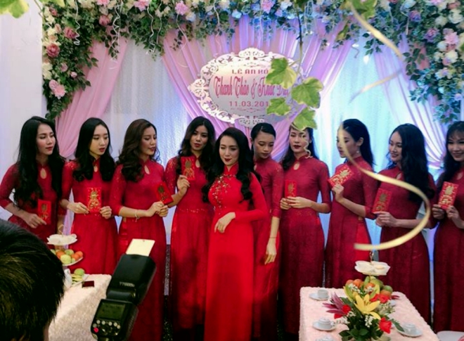 Cô dâu Thanh Thảo diện áo dài đỏ bên cạnh dàn hot girl bê tráp.