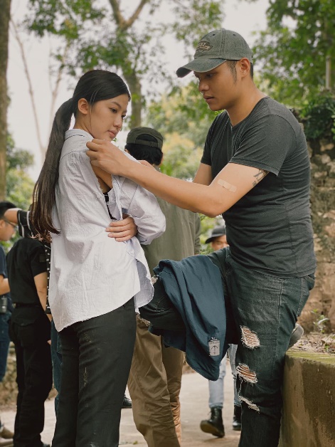 Phan Thắng ân cần chỉnh áo cho Lương Thanh trong một cảnh quay của Tháng năm dữ dội.