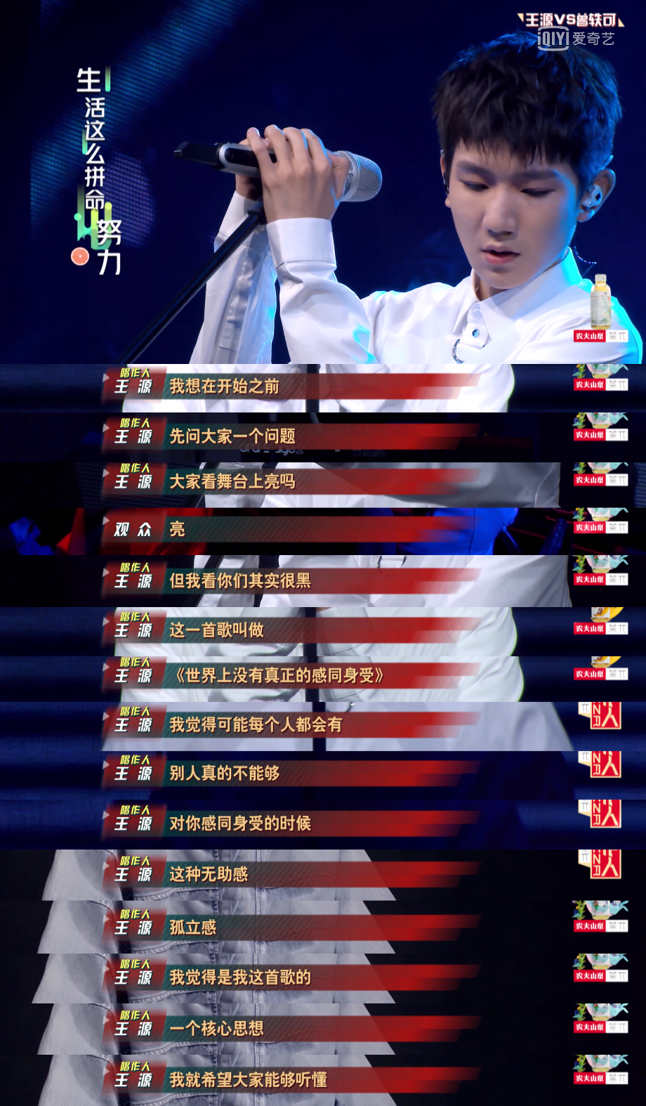 ‘Mọi người thấy trên sân khấu sáng không ? Nhưng em thấy ở dưới rất là tối’ chỉ những câu nói ngắn gọn như vậy cũng đã nói lên câu chuyện của người sáng tác và cũng khiến cho khán giả nhìn được một mặt khác mà mỗi ngày Vương Nguyên luôn thể hiện vui tươi nhưng đằng sau đó lại rất cô đơn.