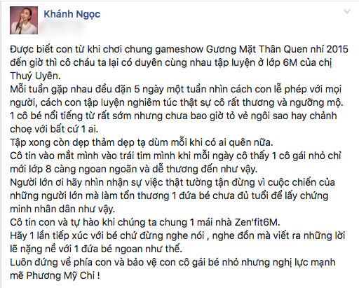 Cô tin vào mắt mình vào trái tim mình khi mỗi ngày cô thấy 1 cô gái nhỏ chỉ mới lớp 8 càng ngoan ngoãn và dễ thương đến như vậy. Người lớn ơi hãy nhìn nhận sự việc thật tường tận đừng vì cuộc chiến của những người lớn mà làm tổn thương 1 đứa bé chưa đủ tuổi để lấy chứng minh nhân dân như vậy. Hãy 1 lần tiếp xúc với bé chứ đừng nghe nói, nghe đồn mà viết ra những lời lẽ nặng nề với 1 đứa bé ngoan như thế. Luôn đứng về phía con và bảo vệ con cô gái bé nhỏ nhưng nghị lực mạnh mẽ Phương Mỹ Chi” - Khánh Ngọc viết.