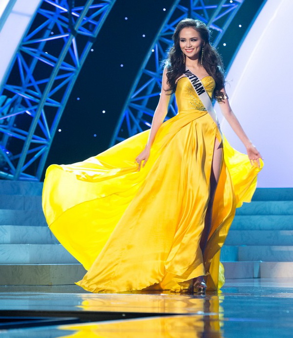 Trường hợp của Diễm Hương cũng tương tự. Chiếc đầm dạ hội màu vàng rực rỡ mà NTK Adrian Anh Tuấn dành cho đại diện Việt Nam tại Miss Universe 2012 được đánh giá khá cao về chất liệu bồng bềnh, màu sắc bắt sân khấu và đường cắt đẹp mắt. Nhưng nó đòi hỏi ở một người đẹp có kĩ năng bung lụa càn quét sân khấu mạnh hơn Diễm Hương.