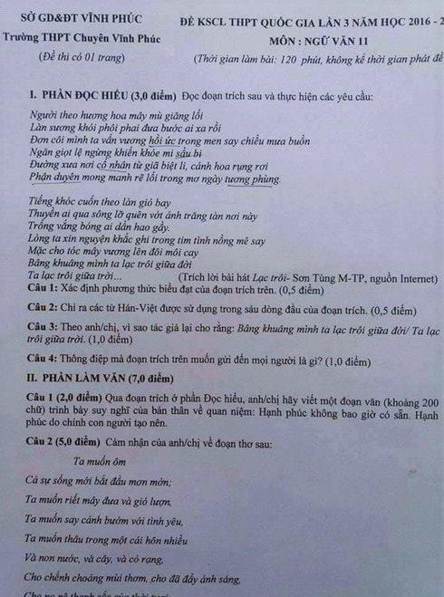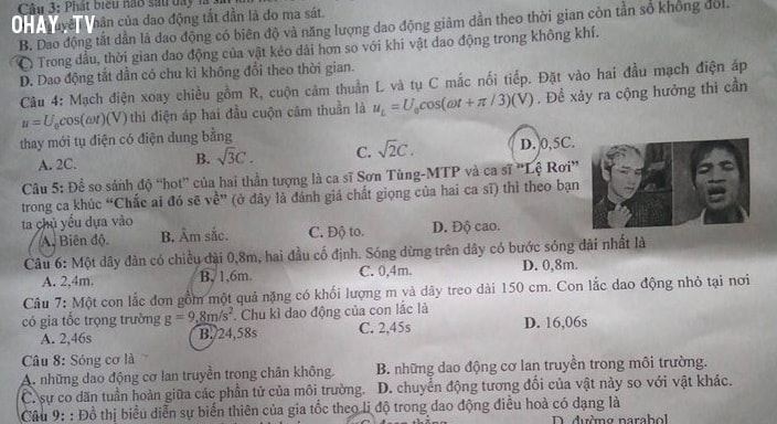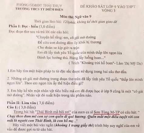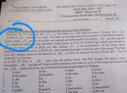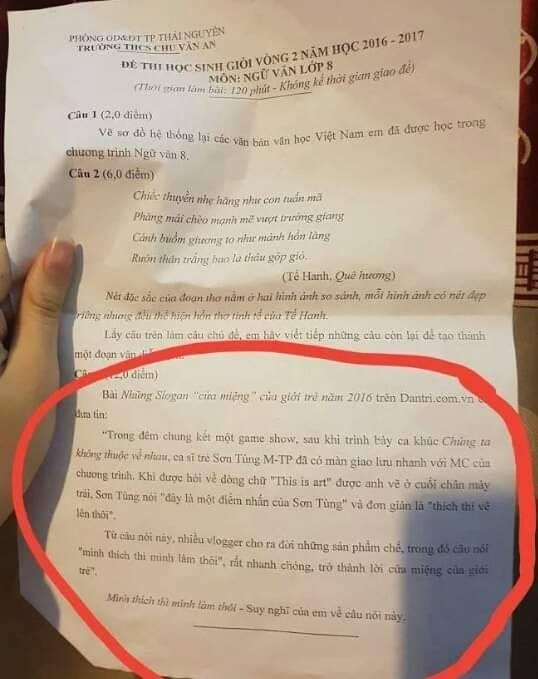 Không chỉ với các cô cậu học sinh đang ngồi trên ghế nhà trường, Sơn Tùng M-TP cũng là nguồn cảm hứng đặc biệt đối với những người cầm phấn trên bục giảng. Bằng chứng là thời gian qua, có rất nhiều đề thi của thầy cô, chẳng biết vô tình hay cố ý, đã nhắc tới tên tuổi, ca từ trong bài hát đang hot của nam ca sĩ.