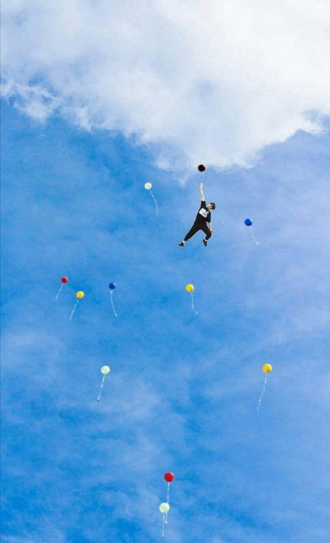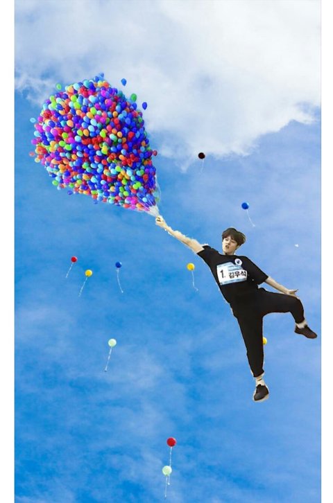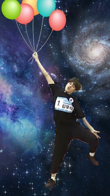 Đầu tiên, bức hình trong phòng tập nhảy được khéo léo thêm vào một chùm bóng bay nhấc bổng cả anh chàng Kim Wooseok.