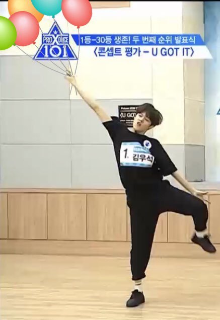 Ở buổi tổng duyệt trình diễn ca khúc You Got It, anh chàng Kim Wooseok đã bị bắt gặp một khoảnh khắc khá phiêu theo điệu nhảy và để lộ tư thế khá lạ mắt. Đây là nguồn cảm hứng để fan chế ra hàng chục tấm hình với anh chàng đang nắm… cả chùm bóng bay treo lơ lửng.