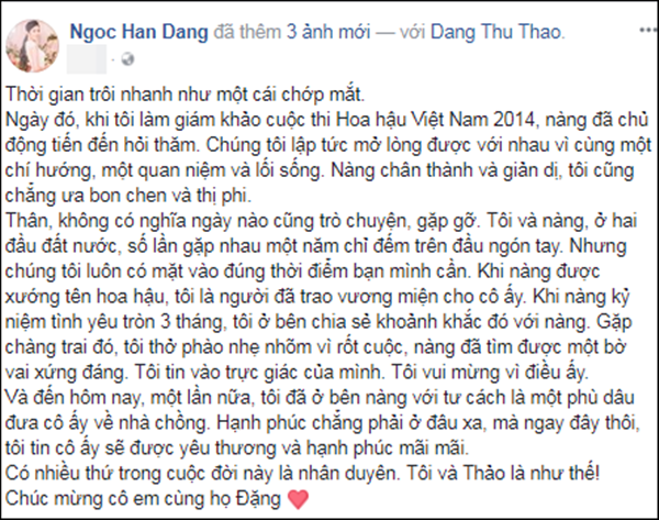 Về phía Ngọc Hân và Đặng Thu Thảo, được biết, tình cảm của cả hai rất tốt, là chị em thân thiết nhiều năm. Hoa hậu Ngọc Hân đã dành những dòng chia sẻ đầy tình cảm gửi đến Đặng Thu Thảo nhân ngày cô em thân thiết “theo chồng về dinh”, khiến người hâm mộ không khỏi xuýt xoa, cảm động. Cả hai là minh chứng rằng giữa showbiz vốn còn nhiều hoài nghi thì vẫn còn đó những tình cảm đẹp như thế!