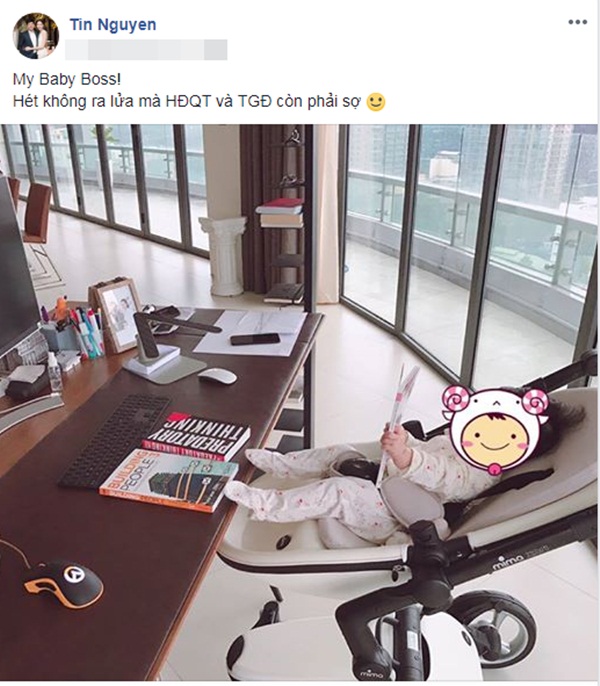 Cách đây vài ngày, ông xã doanh nhân của Đặng Thu Thảo cũng đăng tải hình ảnh con gái cùng dòng trạng thái hóm hỉnh: “My baby boss! Hét không ra lửa mà hội đồng quản trị và tổng giám đốc còn phải sợ“.