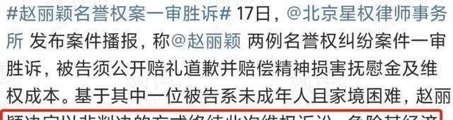 Ngày 17 tháng 3, văn phòng luật sư Tinh Quyền Bắc Kinh đã đăng thông báo Triệu Lệ Dĩnh chiến thắng trong vụ kiện xâm phạm danh dự trên mạng. Bị cáo cần phải công khai xin lỗi trên weibo cũng như tiến hành bồi thường cho Triệu Lệ Dĩnh. Xét rằng trong số bị cáo có một người chưa thành niên, gia cảnh khó khăn, Triệu Lệ Dĩnh quyết định lấy hình thức không tuyên án để hoàn thành khởi tố, đồng thời miễn việc bồi thường. Không thể không nói hành động này lần của Triệu Lệ Dĩnh đã mang về không ít hảo cảm cho cư dân mạng.