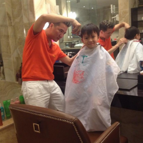 Đàm Vĩnh Hưng tự tay cắt tóc cho con trai nuôi.