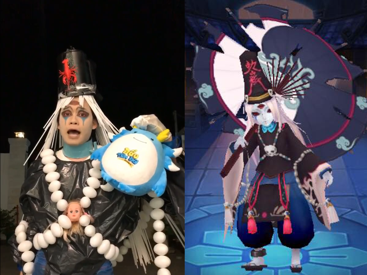 Gino Tống cosplay đầy thần thái dù đầu đội lồng quạt