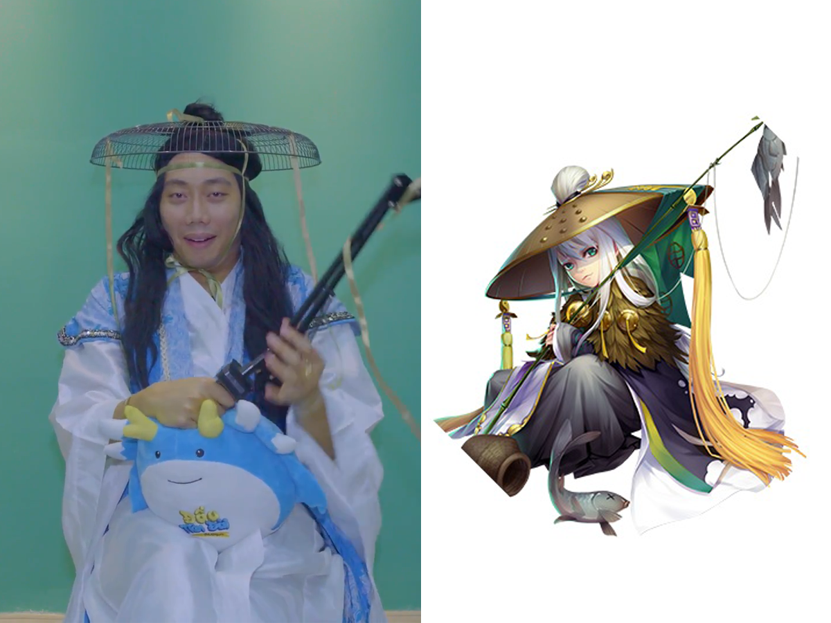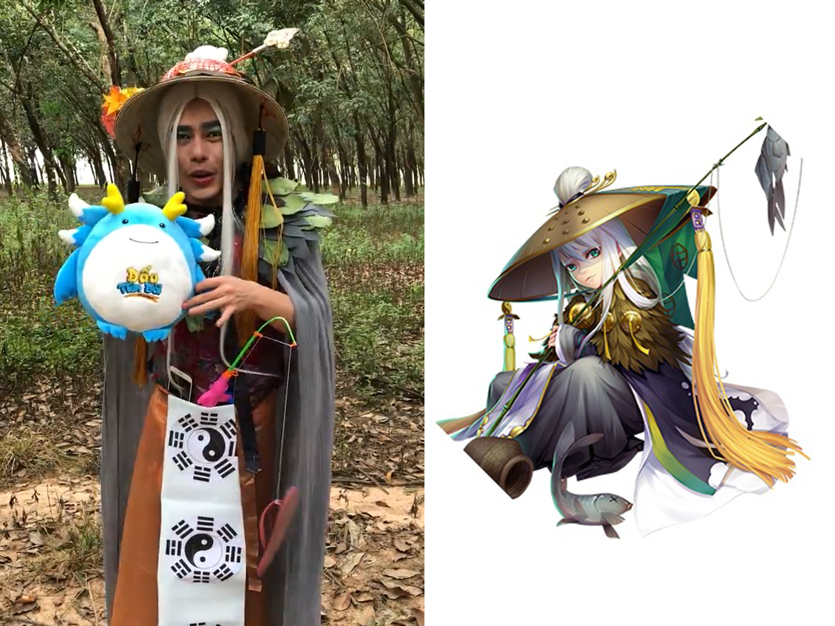 Hotface Gino Tống thì có phần đầu tư hơn một chút là “mướn” hẳn bộ đồ chỉ còn thiếu cái mũ và cây cần câu thôi. Ngoài bộ cosplay có đầu tư thì Gino Tống còn cố gắng tỏ ra thần thái hơn so với Lê Dương Bảo Lâm.Với cách diễn nhập tâm như vậy, chắc hẳn không khó để fan của Gino đoán ra nhân vật mà Gino đang cosplay là thần tướng nào của game Đấu Tiên Đài để rinh quà rồi.
