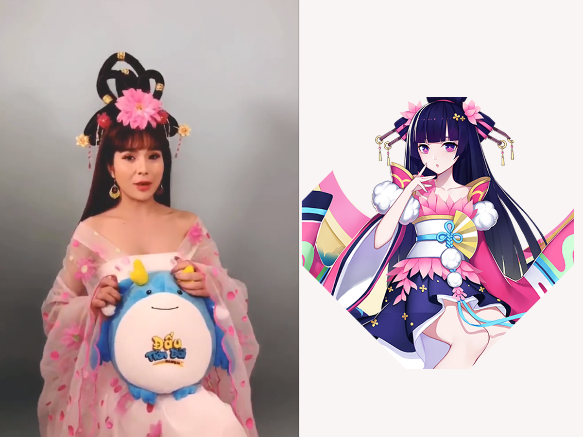 Khác với phong cách “bựa” của các sao nam, Ny Saki cũng tranh thủ cosplay thành một tiên nữ dịu dàng với phần trang phục đầu tư vô cùng gợi cảm. Cô nàng cũng ra sức đánh đố fan hâm mộ đoán ra nhân vật mình đang hóa thân để treo giải thưởng là gấu bông Đậu Đậu.