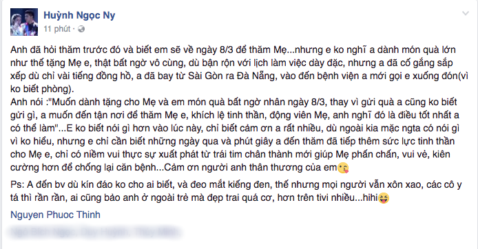 Nhân dịp 8/3 hôm nay, Noo Phước Thịnh đã bí mật bay từ TP HCM ra Đà Nẵng thăm bệnh tình của mẹ Ngọc Ny, khiến cả hai mẹ con cô nàng không khỏi xúc động. Được biết, dù bận kín lịch, tuy nhiên, để mang đến một món quà ý nghĩa cho cô học trò của mình, Noo Phước Thịnh đã tranh thủ thời gian để góp mặt trong một ngày ý nghĩa như thế này. “Muốn dành tặng cho mẹ và em món quà bất ngờ nhân ngày 8/3, thay vì gửi quà anh cũng không biết gửi gì, anh muốn đến tận nơi để thăm mẹ em, khích lệ tinh thần, động viên mẹ, anh nghĩ đó là điều tốt nhất anh có thể làm”, chia sẻ của nam HLV khiến Ngọc Ny thêm phần xúc động.