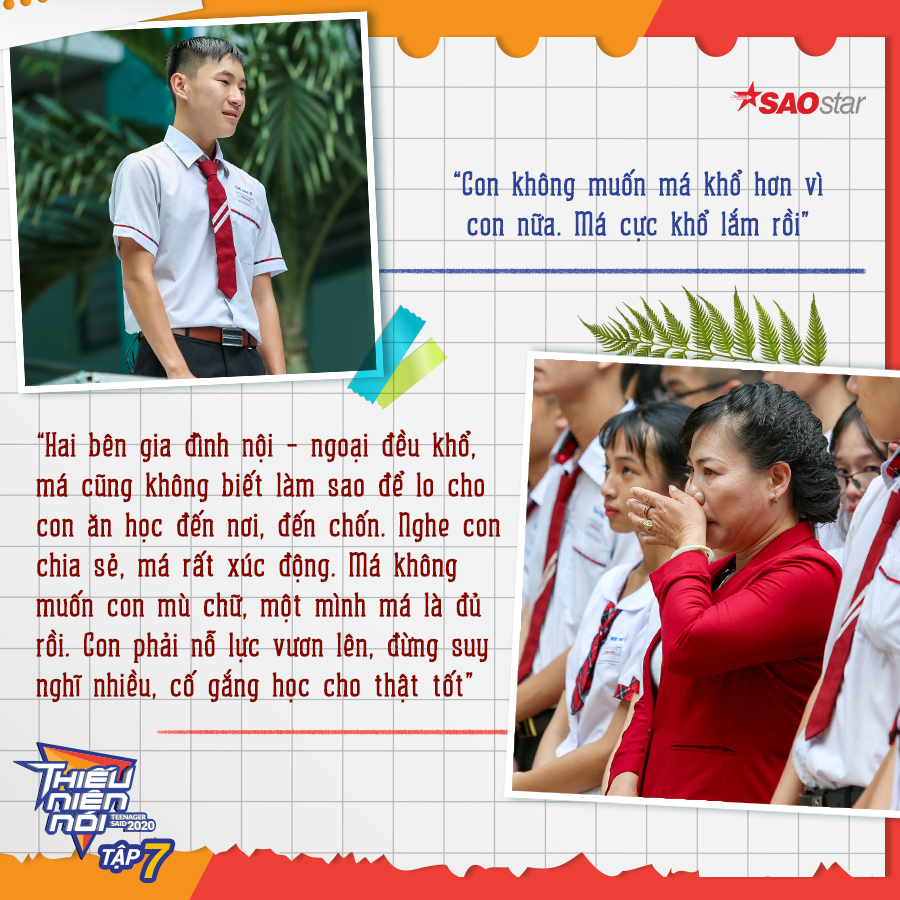 Hiểu được nỗi lòng của ba mẹ luôn yêu thương và chăm sóc không kể vất vả suốt 16 năm qua, Chí Hải rơi nước mắt khi biết chuyện mẹ đi mượn tiền để lo cho em ăn học thành tài. Câu chuyện của cậu bé lớp 11 đề cao sự hy sinh thầm lặng của những bậc làm cha, làm mẹ: Dù cuộc sống có khó khăn, vất vả như thế nào, họ vẫn luôn cố gắng để lo cho con cái ăn học đến nơi đến chốn.