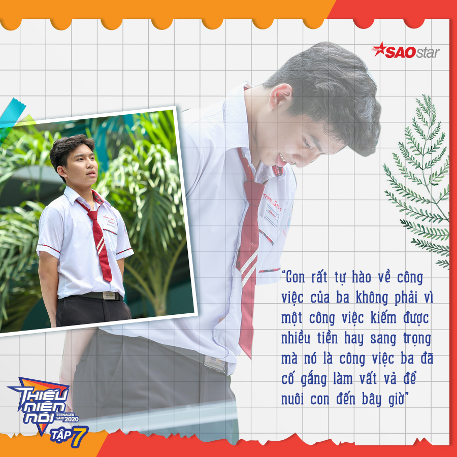 Nếu ở tập 3 Thiếu niên nói 2020, người xem từng đau xót khi lắng nghe câu chuyện của cô bé lớp 10 kể về 1 một ông bố lái xe ôm công nghệ có cô con gái xấu hổ về công việc của ông. Thì trong tập 7, cậu bé lớp 10 - Thành Luân nhận được nhiều lời khen khi biết tự hào về người bố đơn thân làm nghề bảo vệ. Dù bố mẹ có làm bất kỳ nghề nghiệp nào đi chăng nữa thì cuối cùng cũng vì kiếm tiền để vun đắp cho tương lai của những đứa con.