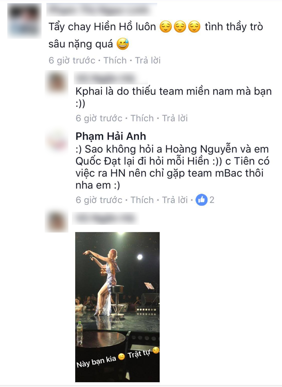 Ngay lập tức, một bạn thí sinh trong team của Tóc Tiên đã nhanh chóng lên tiếng giải thích sự thiếu vắng Hiền Hồ trong buổi hẹn hôm đó. Do có công việc tại Hà Nội nên nữ ca sĩ Big Girl's Don't Cry đã hẹn các bạn đang sống ở miền Bắc để gặp mặt, nói chuyện. Còn Hiền Hồ hiện đang sống và làm việc ở TP.HCM nên không thể nào tham gia được.