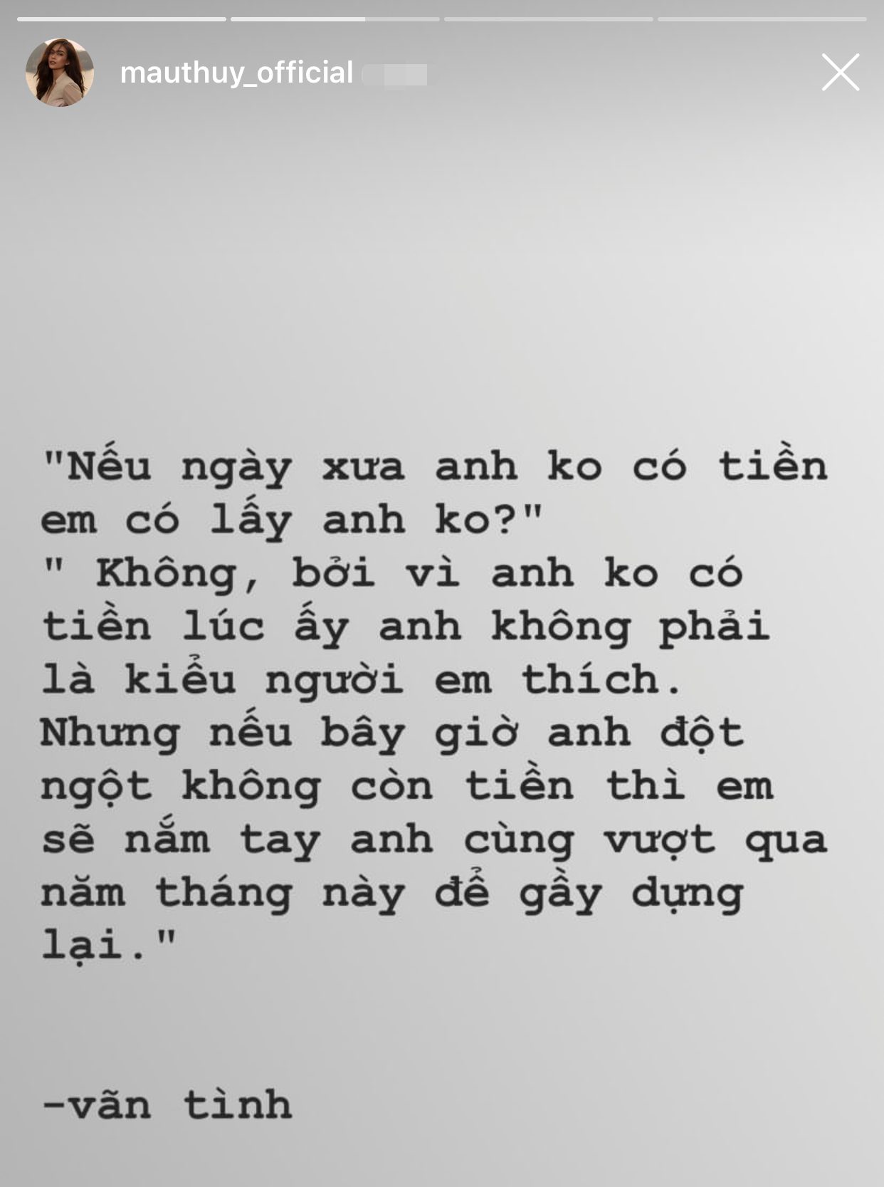 Mâu Thuỷ cũng chia sẻ những triết lí tình yêu sâu sắc kèm theo ở những dòng story tiếp theo trên trang cá nhân để thể hiện tình yêu cùng bạn trai đang tươi đẹp và nở rộ trong hương say tình cảm. Việc cô nàng công khai người yêu cùng với những bài đăng lãng mạn như thế này thật khiến nhiều người hâm mộ phải bất ngờ. Từ trước đến nay, khán giả chỉ thấy Mâu Thuỷ chủ yếu qua hình ảnh của một người đẹp mạnh mẽ, kiên trì và bản lĩnh trong cuộc sống, thì hôm nay, cô nàng như quay 180 độ, trở thành một cô gái dịu dàng và ngọt ngào bên cạnh người yêu.