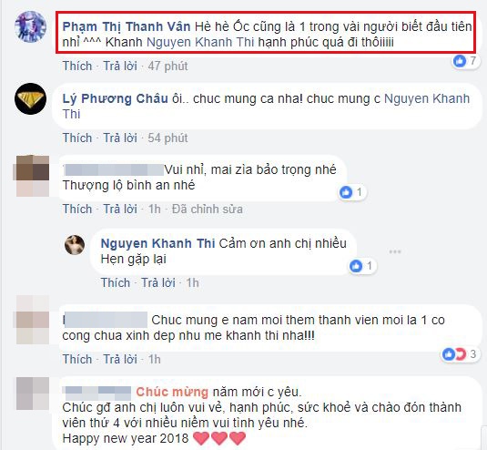 MC Ốc Thanh Vân viết: “Ốc cũng là 1 trong vài người biết đầu tiên nhỉ. Nguyễn Khánh Thi hạnh phúc quá đi thôi“. Nhiều khán giả cũng chúc mừng hai vợ chồng Khánh Thi - Phan Hiển.