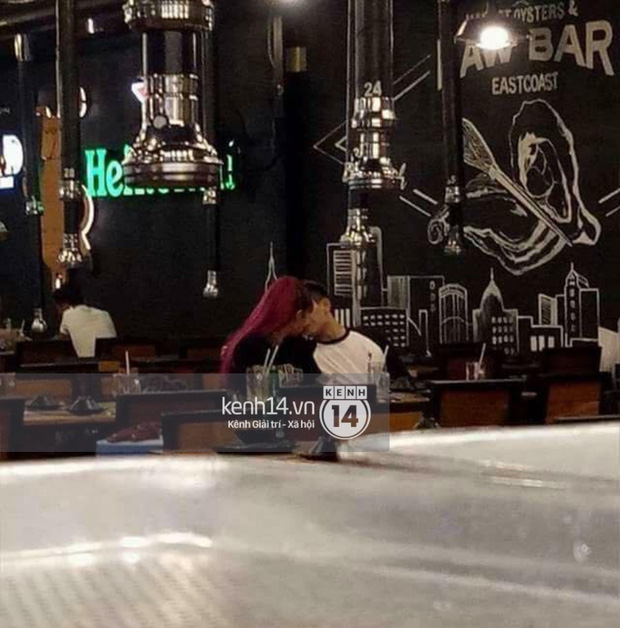Bức ảnh được cho rằng Khởi My và Kelvin Khánh khóa môi trong quán ăn bị một nhân viên chụp lại đang được cộng đồng mạng chia sẻ chóng mặt. (Ảnh: Kenh14.vn)