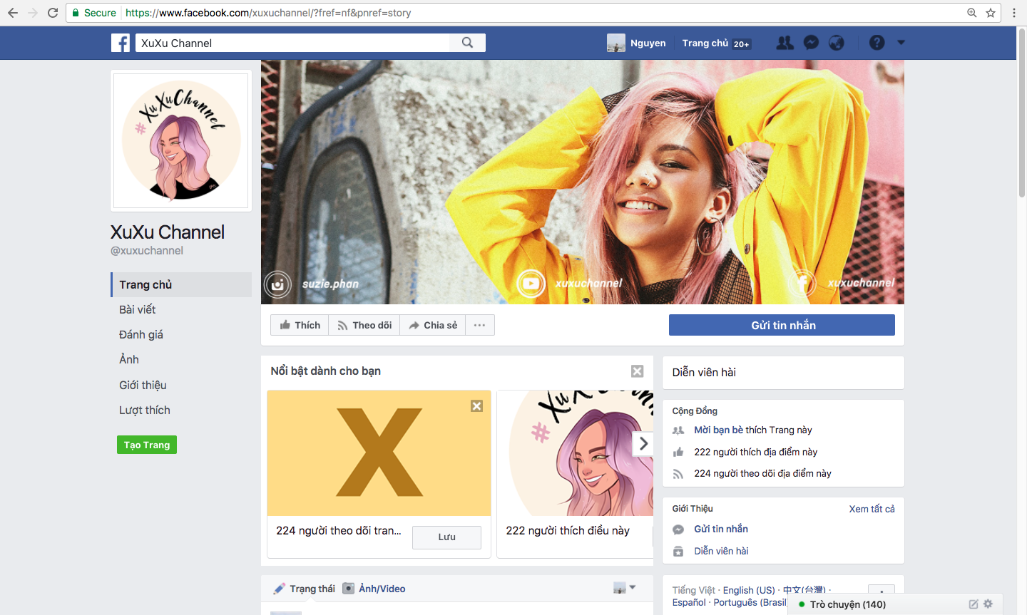 Page riêng của Quỳnh Như phục vụ cho kênh Youtube.