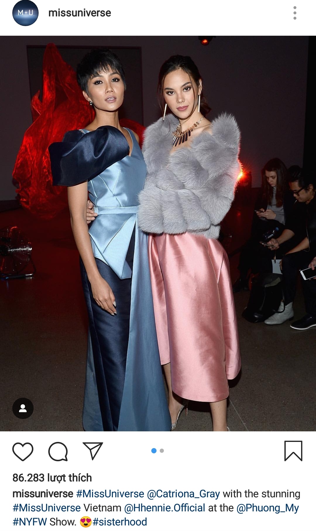 Instagram chính thức cùa cuộc thi Hoa hậu Hoàn vũ cũng chia sẻ hình ảnh của 2 mỹ nhân Philippines và Việt Nam. Dù đây không phải là lần đầu tiên H'Hen Niê chiếm sóng kênh mạng xã hội Miss Universe nhưng các fan vẫn ít nhiều tự hào vì hiếm khi có một đại diện nhan sắc nước nhả nổi bật và được truyền thông quốc tế chú ý đến thế.