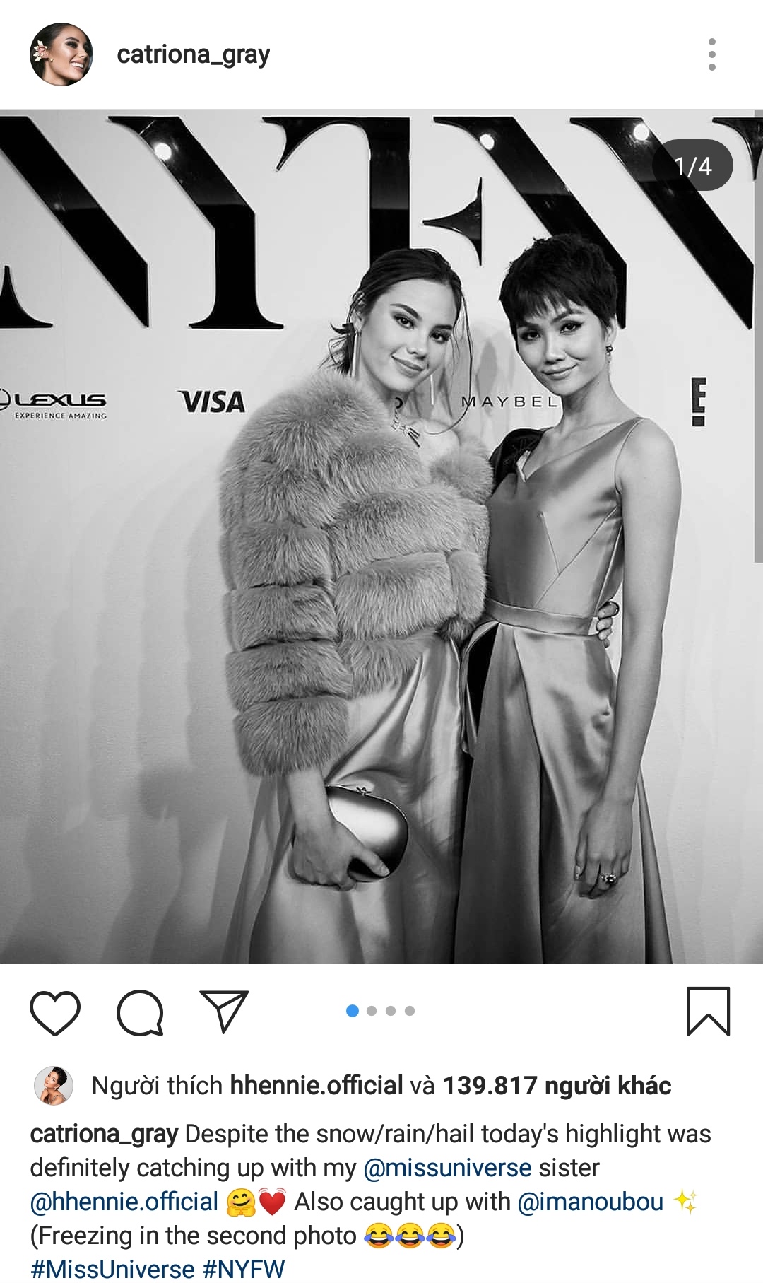 Cùng với những hình ảnh chụp cùng H'Hen Niê tại sự kiện thời trang New York Fashion Week 2019, đương kim Hoa hậu Hoàn vũ chia sẻ: “Bất chấp tuyết, mưa và mưa đá, điểm sáng hôm nay chắc chắn thuộc về người chị em Miss Universe của tôi - H'Hen Niê“. Hầu hết các fan đều thích thú khi 2 người đẹp châu Á sớm hội ngộ, thân thiết bên nhau sau khi cùng lọt Top 20 (cùng nhóm thí sinh châu Á), Top 10 và Top 5 chung cuộc Miss Universe 2018.