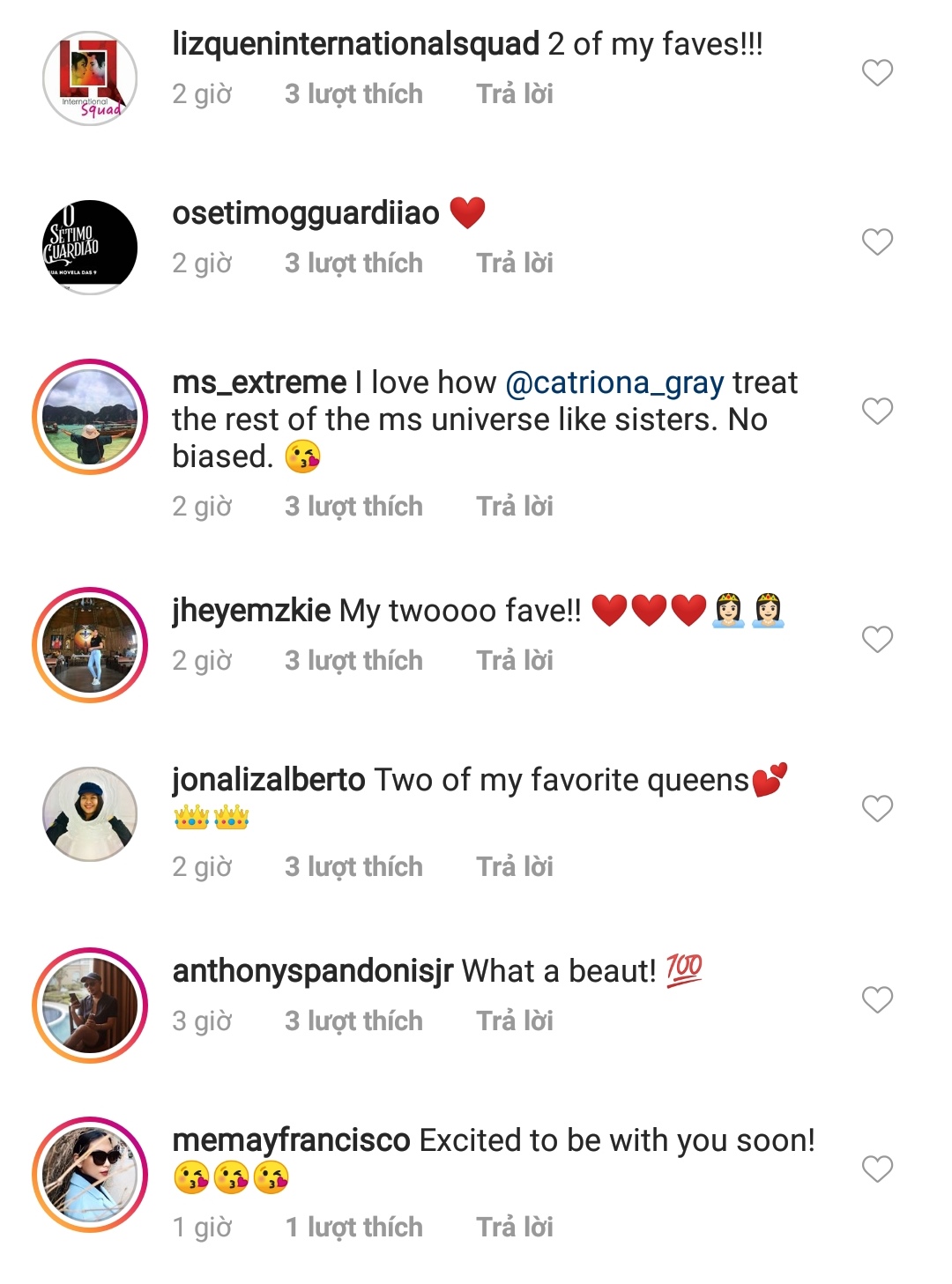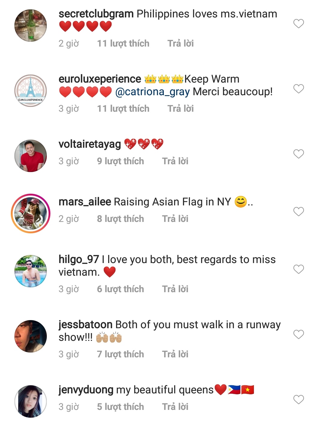 Đặc biêt, đông đảo người hâm mộ để lại bình luận bảy tỏ sự ủng hộ tình bạn đẹp của H'Hen Niê và Catriona Gray. Nhiều fan còn cho rằng đây là khoảnh khắc họ chờ đợi từ lâu bới Philippines và Việt Nam là 2 đại diện đông fan cũng như cùng được yêu thích nhất tại Miss Universe 2018.