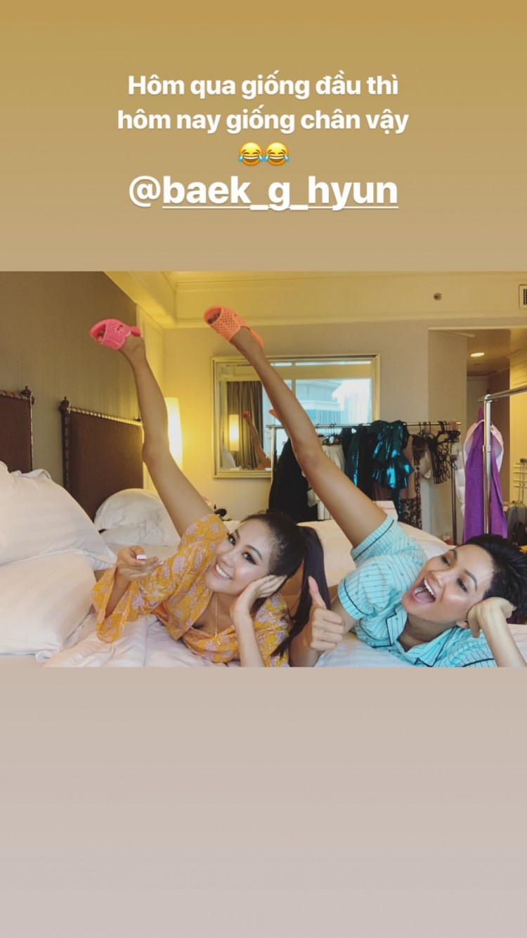 Bên cạnh đó, H'Hen Niê cũng chia sẻ nhiều điều về tình bạn đẹp cùng đại diện Hàn Quốc. Cô còn làm động tác mà mình và Miss Universe Korea nhắc nhở nhau “bớt ăn kéo béo”. Từ lúc bắt đầu bước vào cuộc thi, người hâm mộ nhanh chóng phát hiện ra rằng cô và Baek Ji Hyun vô cùng gắn bó với nhau. Không những thế, hành động thân thiện cũng như “dính” với nhau mọi lúc mọi nơi của cả hai khiến nhiều fan nhanh chóng nghĩ rằng đây đích thị là một couple mới đã được “khai phá”.