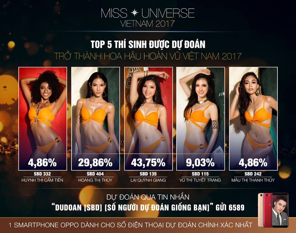 Mới đây, thông qua Fanpage chính thức của Miss Universe Vietnam 2017, BTC cập nhật Top 5 thí sinh được dự đoán giành vương miện.