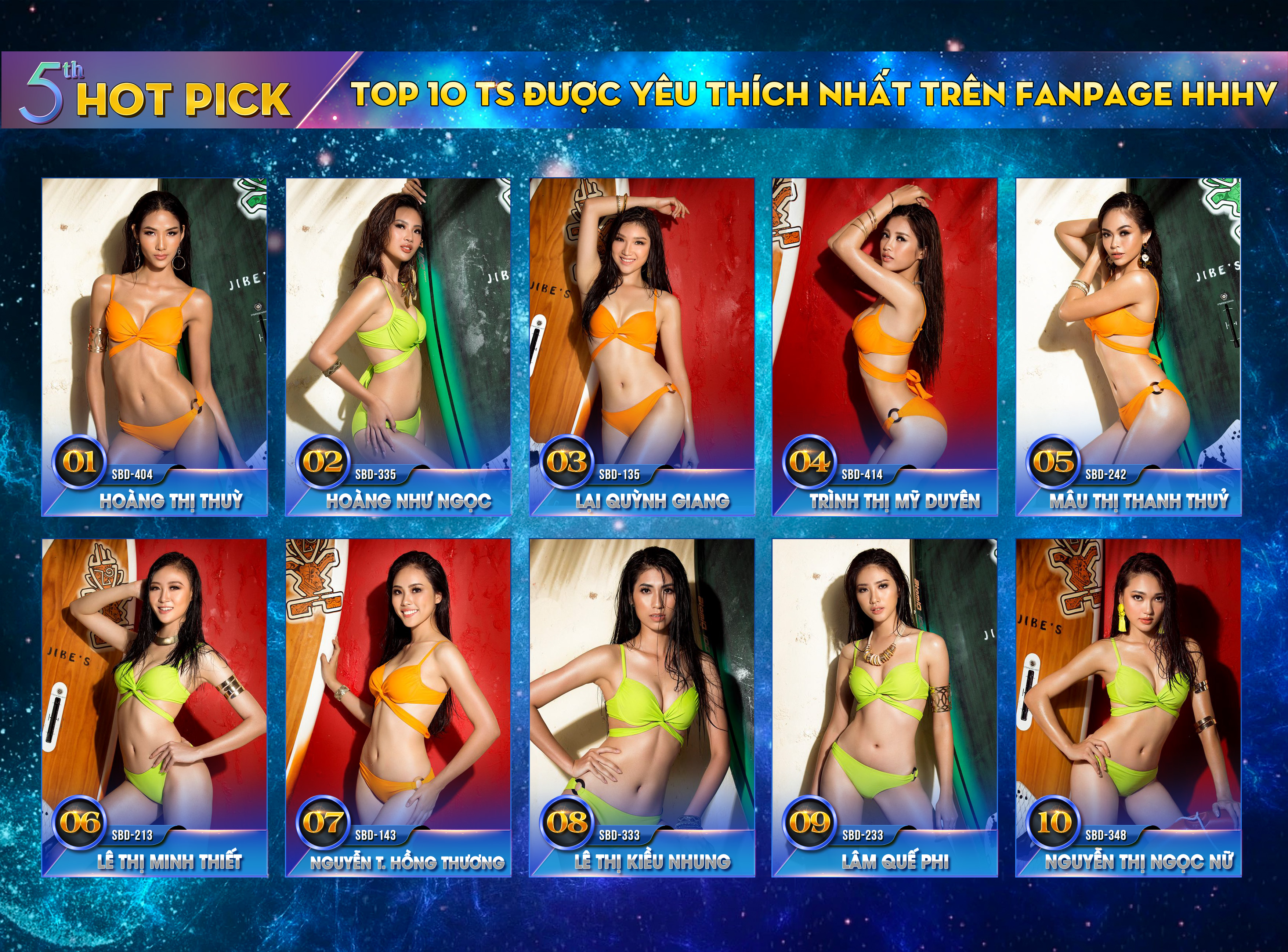 Bảng xếp hạng mới nhất của giải thưởng Thí sinh được yêu thích nhất không có nhiều thay đổi so với lần trước. Theo đó, Top 5 người đẹp dẫn đầu bình chọn lần lượt là Hoàng Thuỳ, Như Ngọc, Quỳnh Giang, Mỹ Duyên và Mâu Thuỷ.