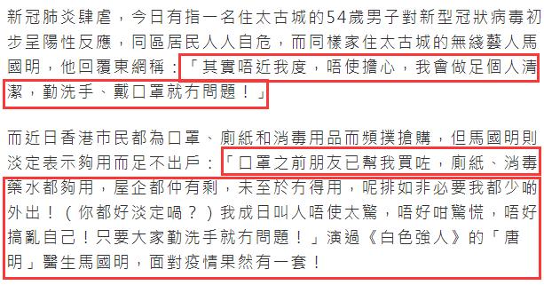 Nhiều dân mạng nói rằng họ rất khâm phục sự điềm tĩnh, bình tĩnh của Mã Quốc Minh khi trong tiểu khu của mình đã có người mắc bệnh. Trước đó từng có nữ nghệ sĩ Hong Kong - Quách Thiếu Vân vì sợ nhiễm bệnh nên lúc ngồi máy bay đã bao bọc kỹ bản thân.