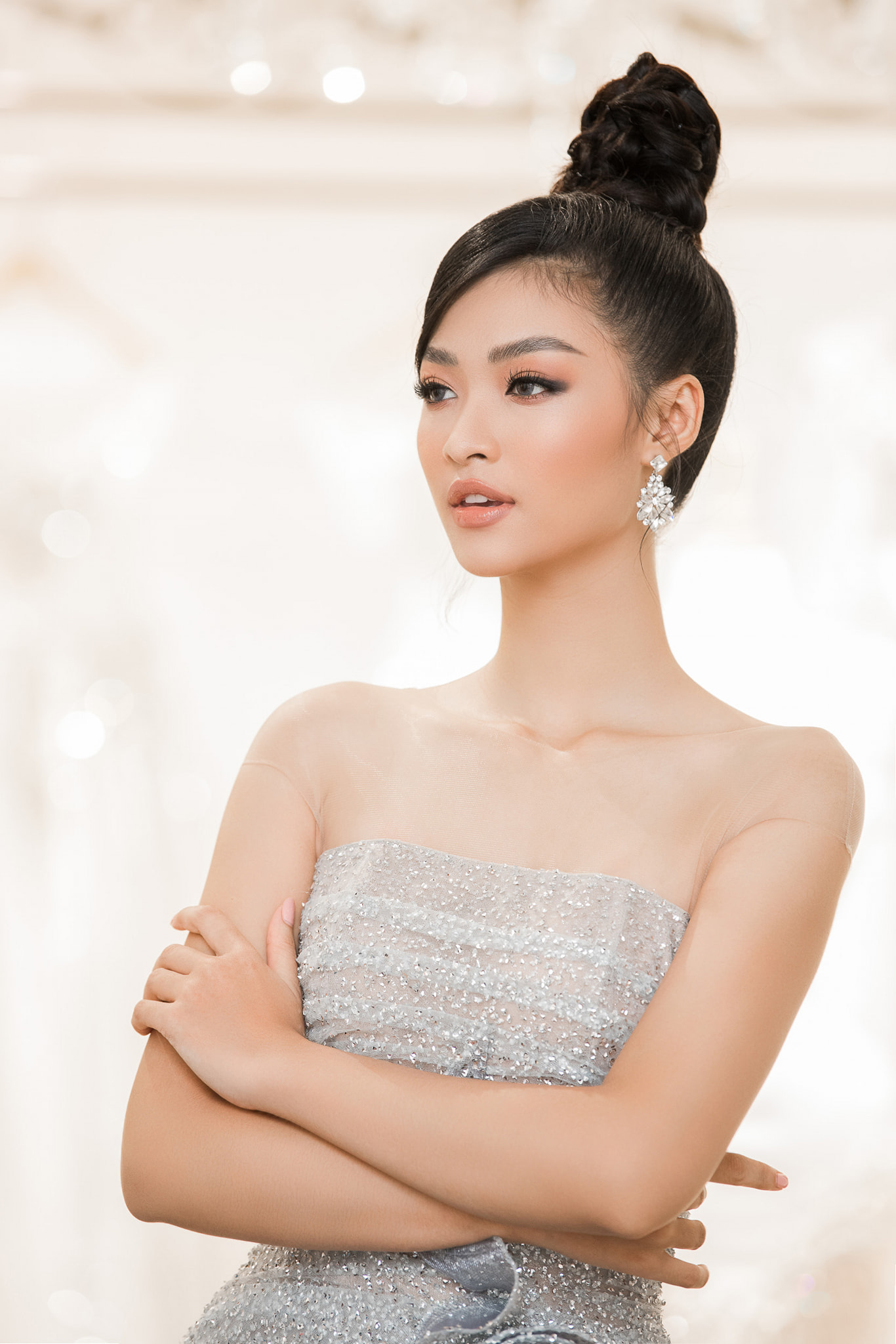 Hướng đến vẻ đẹp quyến rũ, bộc lộ cá tính mạnh mẽ đúng chuẩn đẹp của cuộc thi Miss Grand International, Kiều Loan thường chọn cách pose dáng gợi cảm. Cô nàng khéo khoe cả góc nghiêng gương mặt sắc sảo lẫn đường cong hình thể hút mắt.