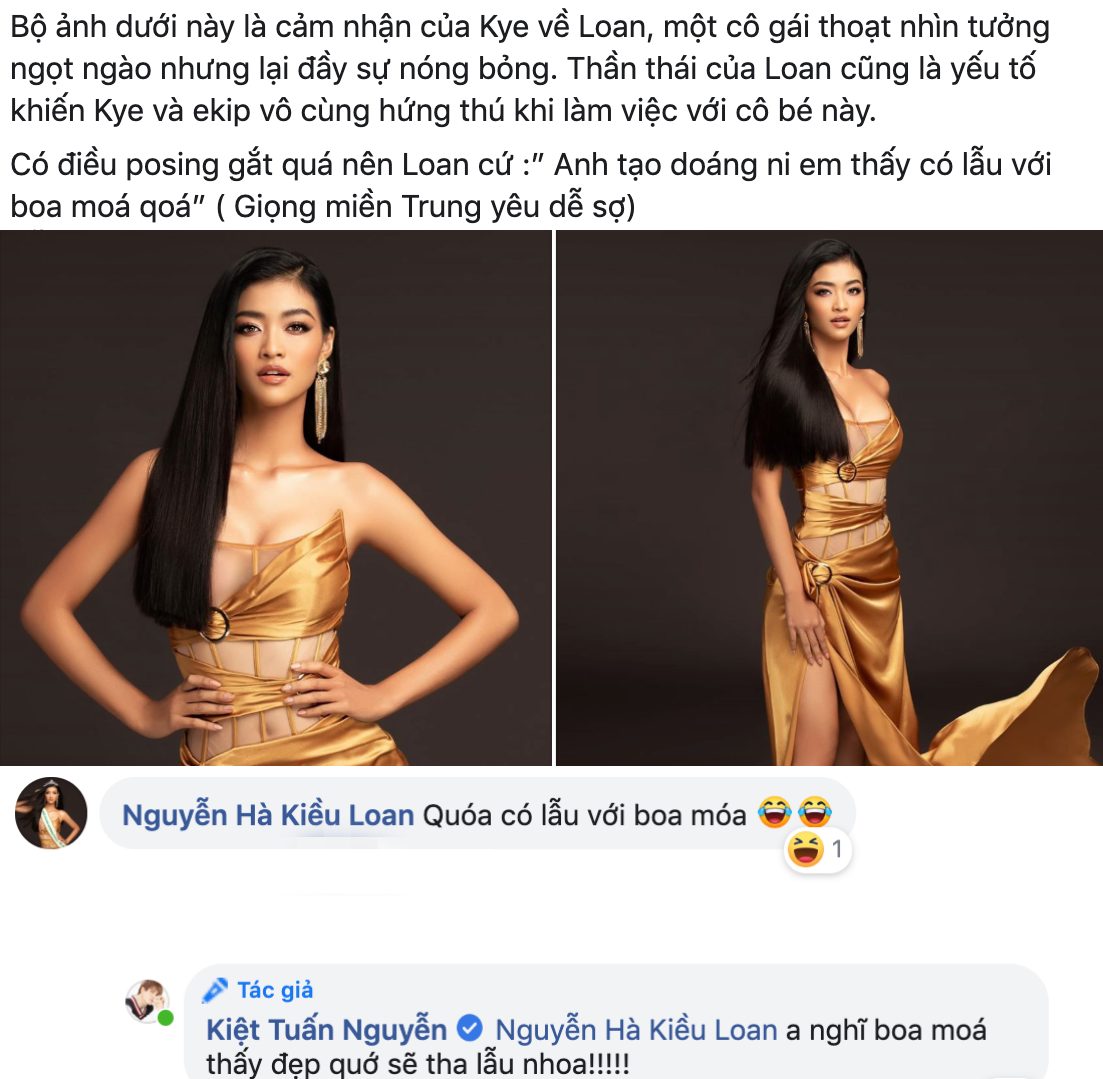 Tự tin và ngày càng ghi điểm với người hâm mộ là thế nhưng ê-kíp của á hậu Kiều Loan lại tiết lộ cô nàng khá ngại ngùng với những pose dáng tạo bạo, “quá đà” vì sợ gây bất ngờ lớn cho ba mẹ ở quê. Dòng chia sẻ của stylist về “nỗi sợ” cô nàng á hậu sinh năm 2000 khiến các fan phì cười thích thú vì quá đáng yêu: “Posing gắt quá nên Loan cứ 'Anh tạo dáng ni em thấy có lỗi với ba má quá'. Giọng miền Trung yêu dễ sợ”. Hóa ra, Kiều Loan vẫn nghĩ về… bố mẹ giữa lúc nỗ lực trau chuốt hình ảnh, “mê hoặc” fan bằng những bức ảnh đầy thần thái, quyến rũ.