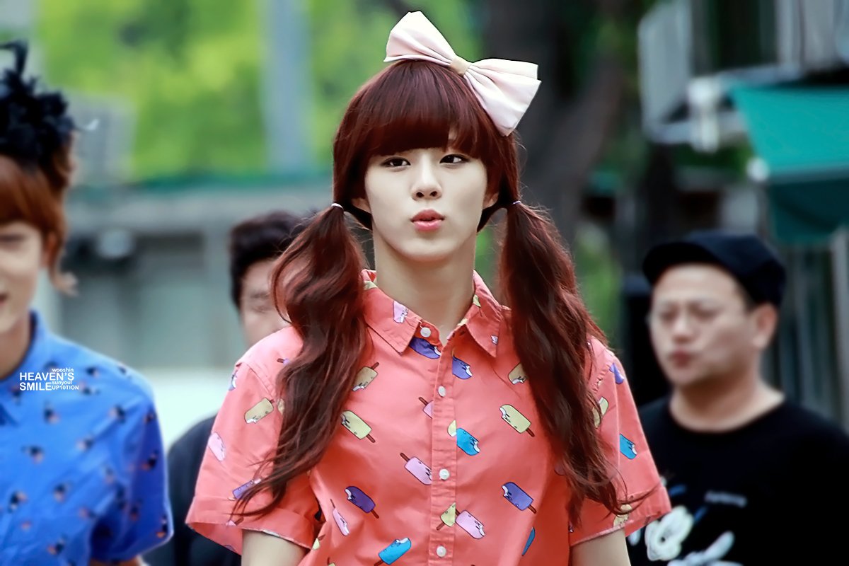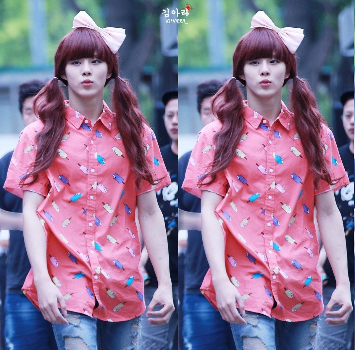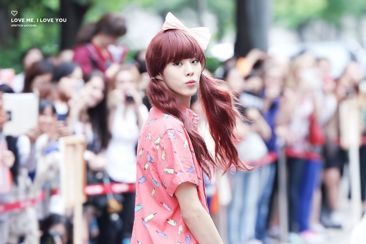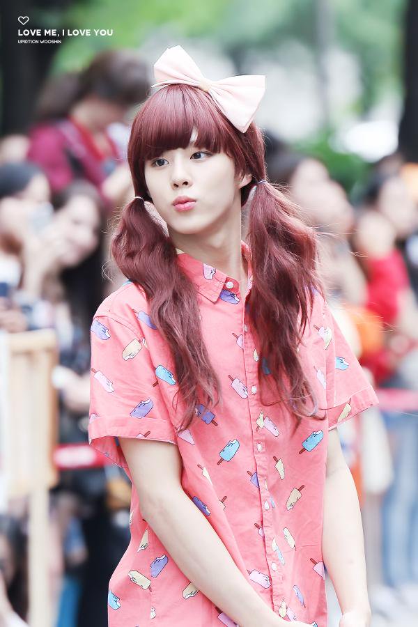 Mặt khác, hình ảnh giả gái trước Kim Woo Seok gây sốt hơn bao giờ hết. Trong buổi đi ghi hình cho chương trình Music Bank cùng các thành viên UP10TION vào ngày 11/09/2015, ngôi sao sinh năm 1996 đã giải gái qua bộ tóc giả dài được cột hai bên, kèm theo chiếc nơ màu hồng xinh xắn trên tóc.