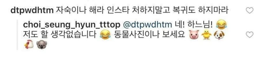 Người này nói: “Hãy phản ánh về hành động sai trái của mình. Ngừng sử dụng Instagram. Thậm chí còn đừng nghĩ đến việc quay trở lại ngành công nghiệp giải trí”. Trước vấn đề này, T.O.P đã trả lời với sự mỉa mai bằng biểu tượng cảm xúc vui tươi: “Vâng! Chúa ơi! Tôi cũng không nghĩ về chuyện đó. Chỉ cần ngắm nhìn những bức ảnh động vật thôi”.