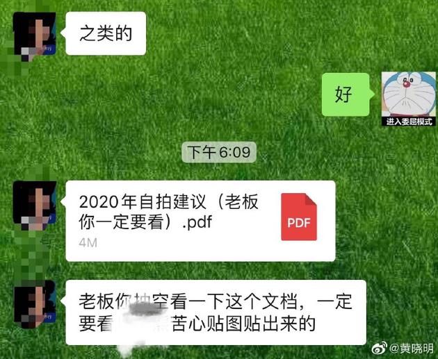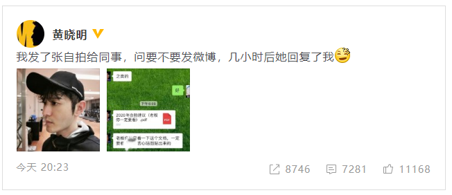 Vào tối ngày 02/01, Huỳnh Hiểu Minh đã đăng tải hình selfie của mình và đoạn chat trò chuyện với đồng nghiệp. Huỳnh Hiểu Minh viết: Tôi gửi hình selfie cho người bạn đồng nghiệp, hỏi ý kiến xem là có nên đăng Weibo hay không nhưng không thấy trả lời. Mấy tiếng sau cô ấy đã trả lời tin nhắn của tôi”.
