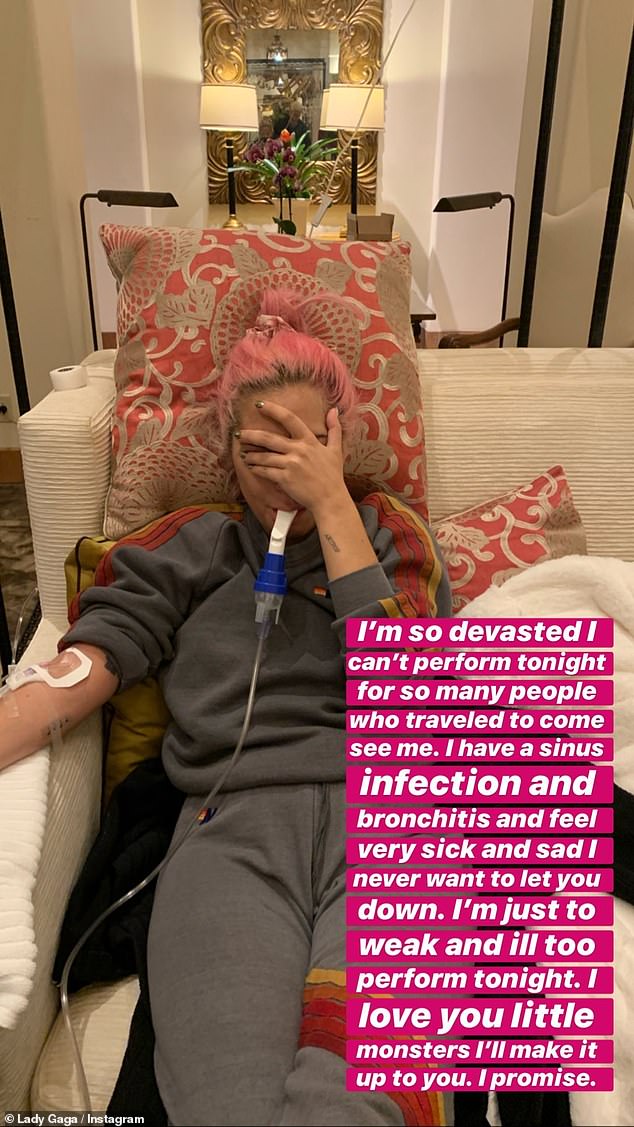 Trên Twitter cá nhân, nữ ca sĩ kiêm nhạc sĩ đã chia sẻ một bức ảnh cô sử dụng ống trợ hô hấp. Lady Gaga viết lên trang cá nhân của mình rằng cô đang “bị hủy hoại” nên cô đành gác việc chạy show sang một bên. Cô đã cố gắng đấu tranh với căn bệnh hết sức có thể nhưng Gaga quá yếu để có hể biểu diễn.
