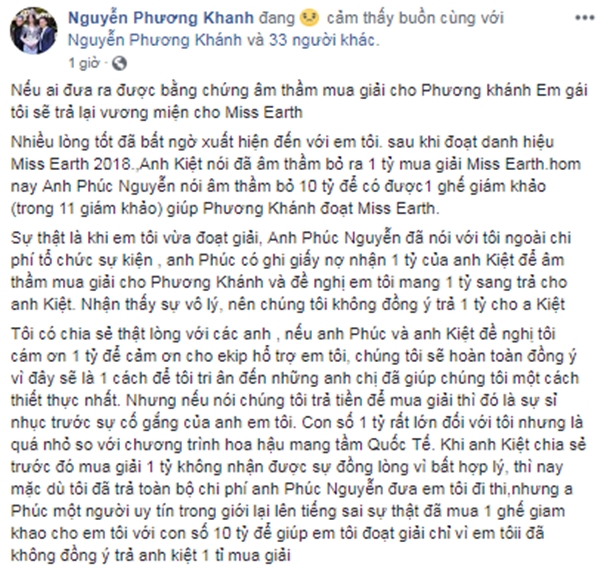Đứng trước thông tin một chiều này, anh trai của hoa hậu Phương Khánh là chuyên gia trang điểm Phương Khanh đã có bài viết dài trên trang cá nhân khẳng định “đưa ra được bất kỳ bằng chứng gì anh đã âm thầm bỏ 10 tỷ mua giải cho em tôi, em tôi sẽ trả lại vương miện cho Miss Earth“.