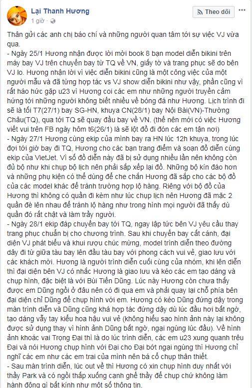 Hương giải thích cặn kẽ để các anh chị hiểu thêm về những gì đã diễn ra trên chuyến bay ngày hôm đó. Dù bất kỳ lý do gì thì qua đây, Hương chân thành xin gửi lời xin lỗi tới mọi người vì không cẩn trọng trong trang phục và thể hiện sự thân thiết quá mức với các tuyển thủ U23.
