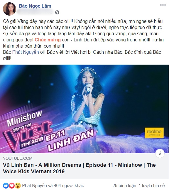 Bên cạnh đó, Lâm Bảo Ngọc còn khẳng định Linh Đan chính là một “giọng ca vàng”, với nhiều tiềm năng đặc biệt cần được khám phá. Do đó, cô luôn đặt ra sự vọng và tâm huyết của mình dành cho chiến binh của đội Phạm Quỳnh Anh - Dương Khắc Linh. Thậm chí, học trò Tuấn Hưng còn hy vọng Linh Đan sẽ giành được ngôi vị quán quân Giọng hát Việt nhí 2019.