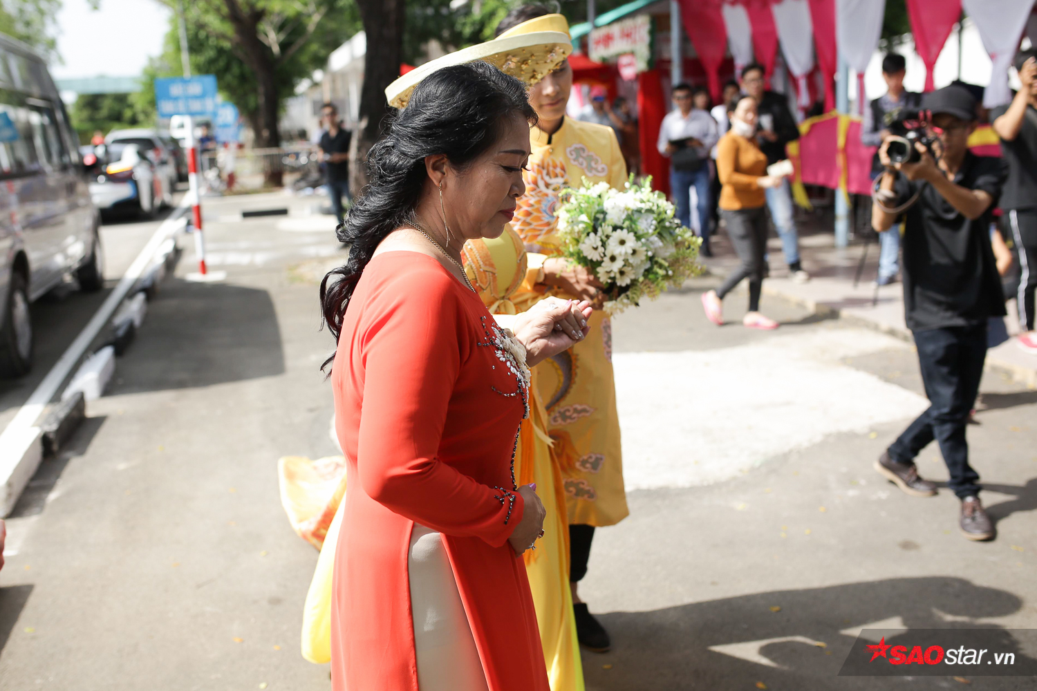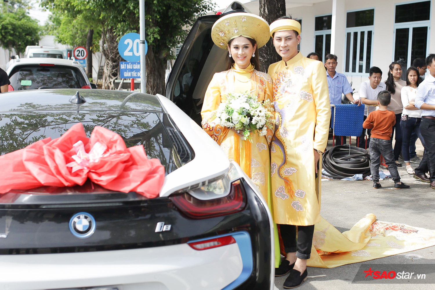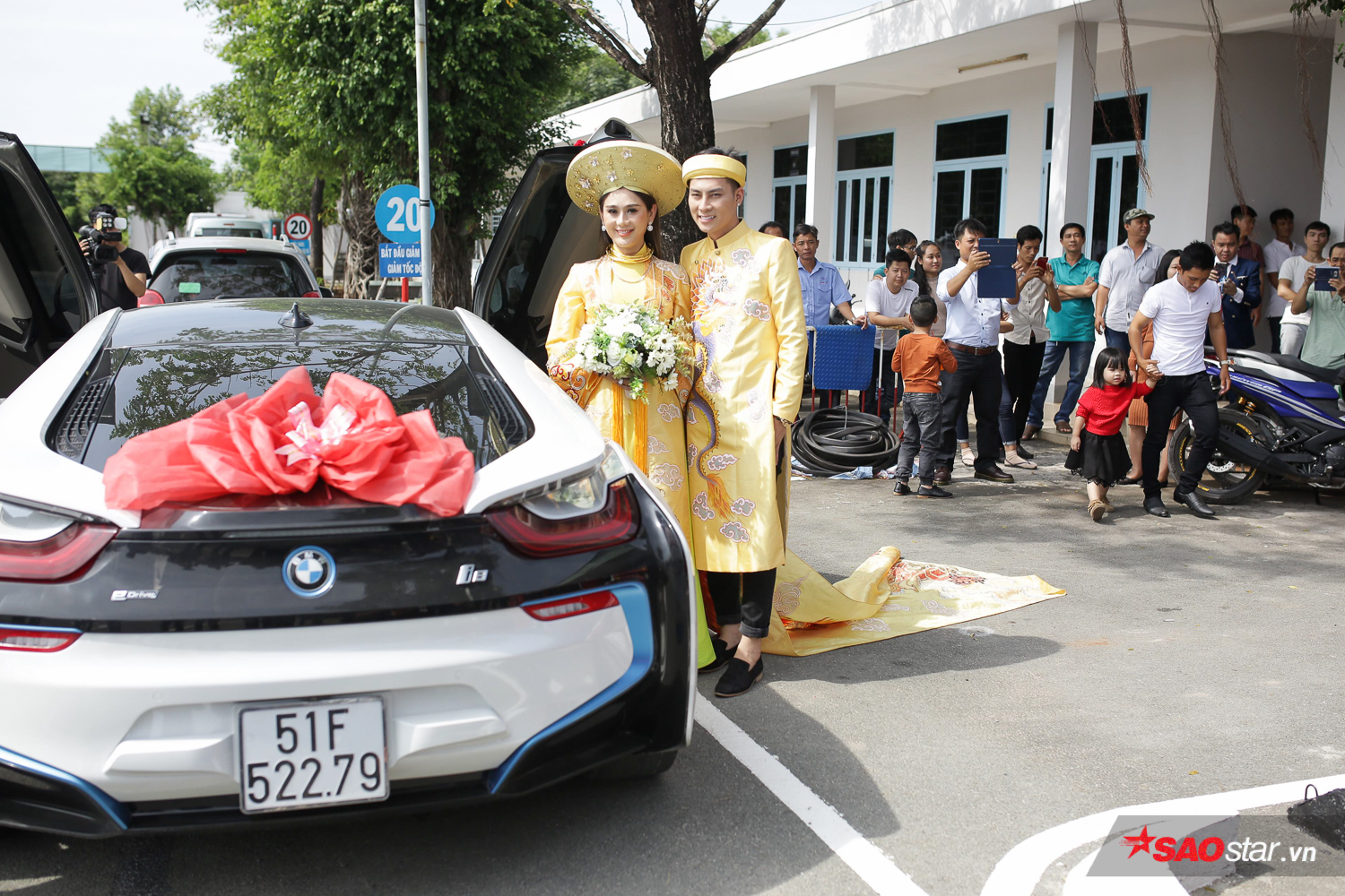 Sự xuất hiện của nữ ca sĩ chuyển giới nhanh chóng thu hút sự quan tâm của đông đảo người dân tại đây. Ngay từ khi bước xuống xe, cô dâu Lâm Khánh Chi đã gây sự chú ý khi diện bộ áo dài thêu hình rồng phượng bắt mắt, đặc biệt phần đuôi áo dài “quét đất”.
