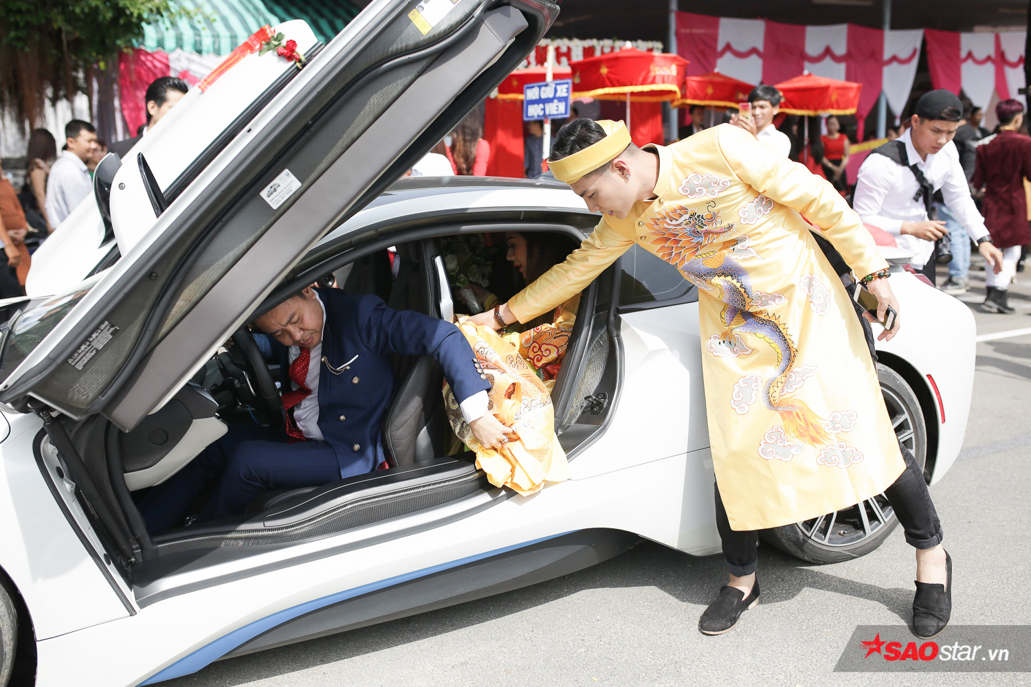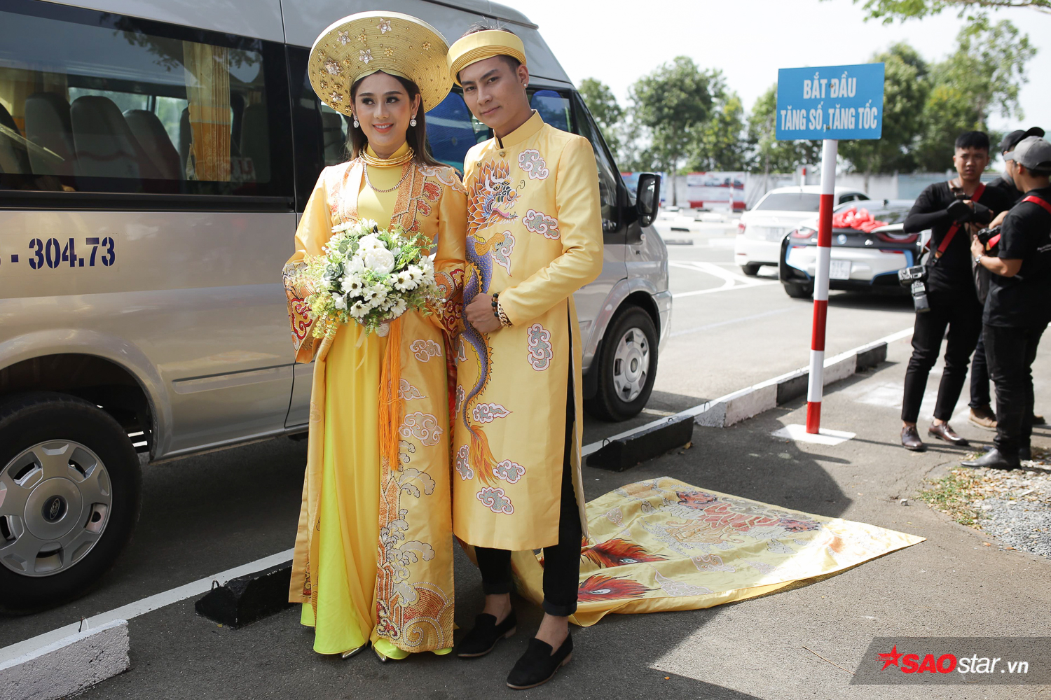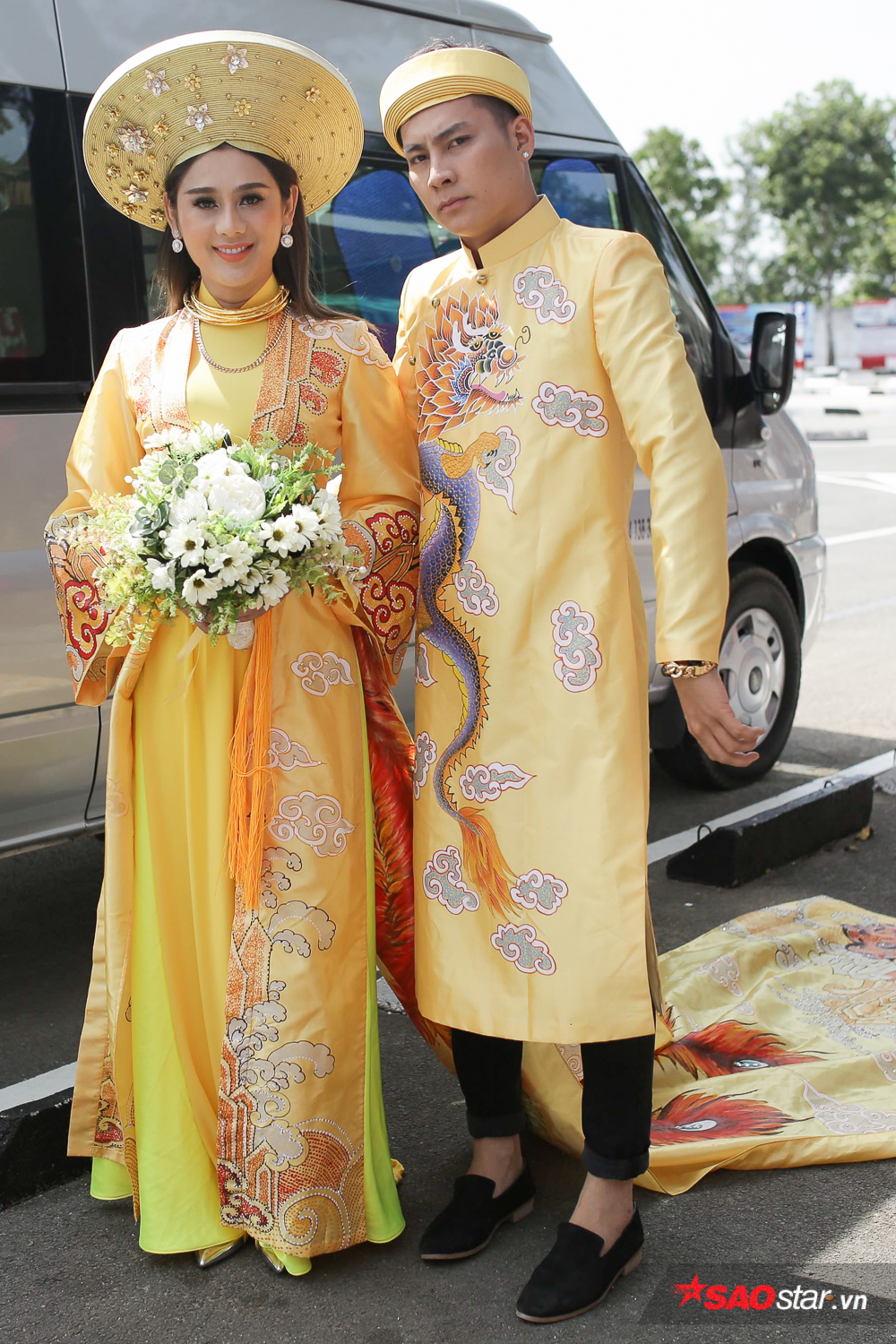 Sự xuất hiện của nữ ca sĩ chuyển giới nhanh chóng thu hút sự quan tâm của đông đảo người dân tại đây. Ngay từ khi bước xuống xe, cô dâu Lâm Khánh Chi đã gây sự chú ý khi diện bộ áo dài thêu hình rồng phượng bắt mắt, đặc biệt phần đuôi áo dài “quét đất”.