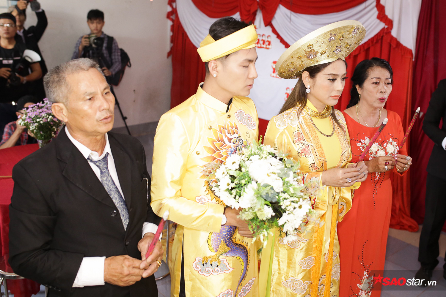 Lâm Khánh Chi và ông xã Phi Hùng thực hiện lễ vái gia tiên tại nhà riêng.